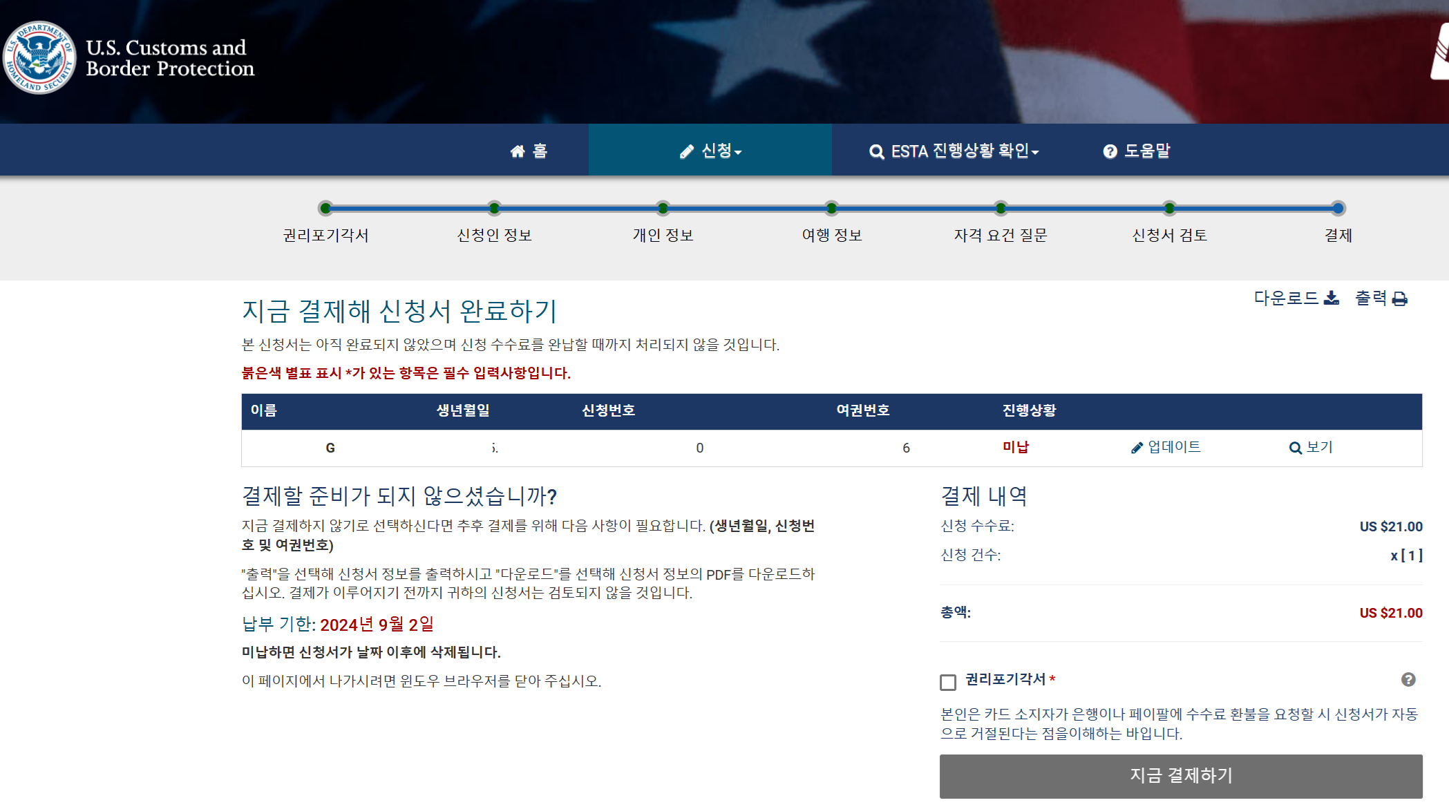 특히 미국 ESTA 비자 신청하다가 마지막 까지 잘했는데, 갑자기 뒤로 가기 해서 결제창이 안 보일 때 해결방법을 알려드리겠습니다.