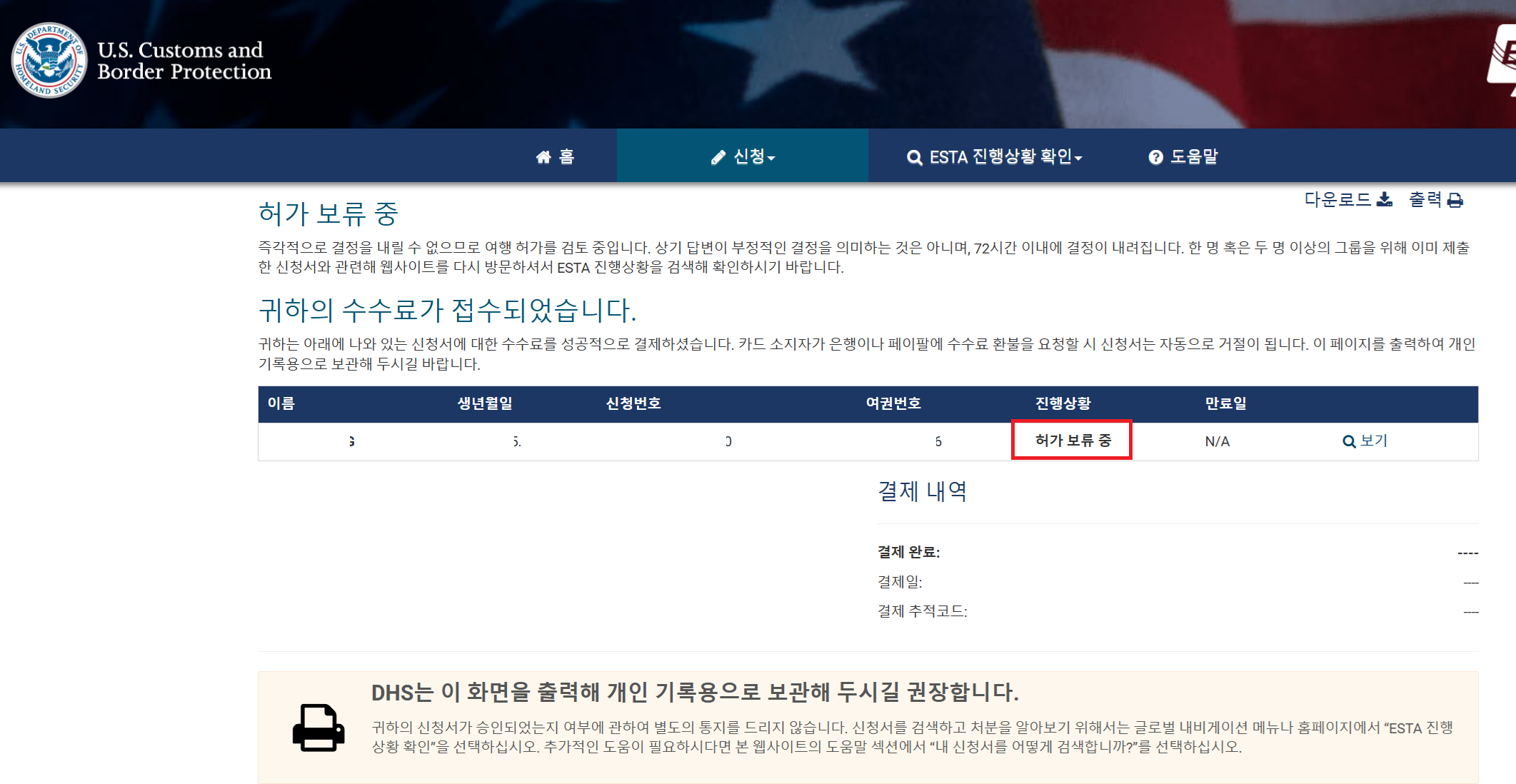 하지만 당연히 보여야 할 결제창이 나오지 않고 해결방법이 명시되지 않아 여기저기 검색해보지만 당장을 확인할 수 있는 방법이 없습니다. 계속 신청번호로 진행상황을 확인해도 동일한 메세지만 반복하여 보입니다. ㅜㅜ