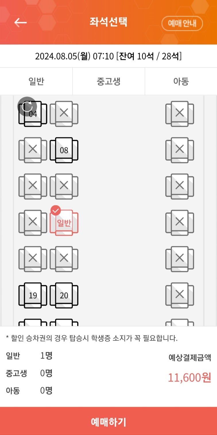 4. 원하는 시간의 버스를 선택 후, 좌석을 선택합니다.