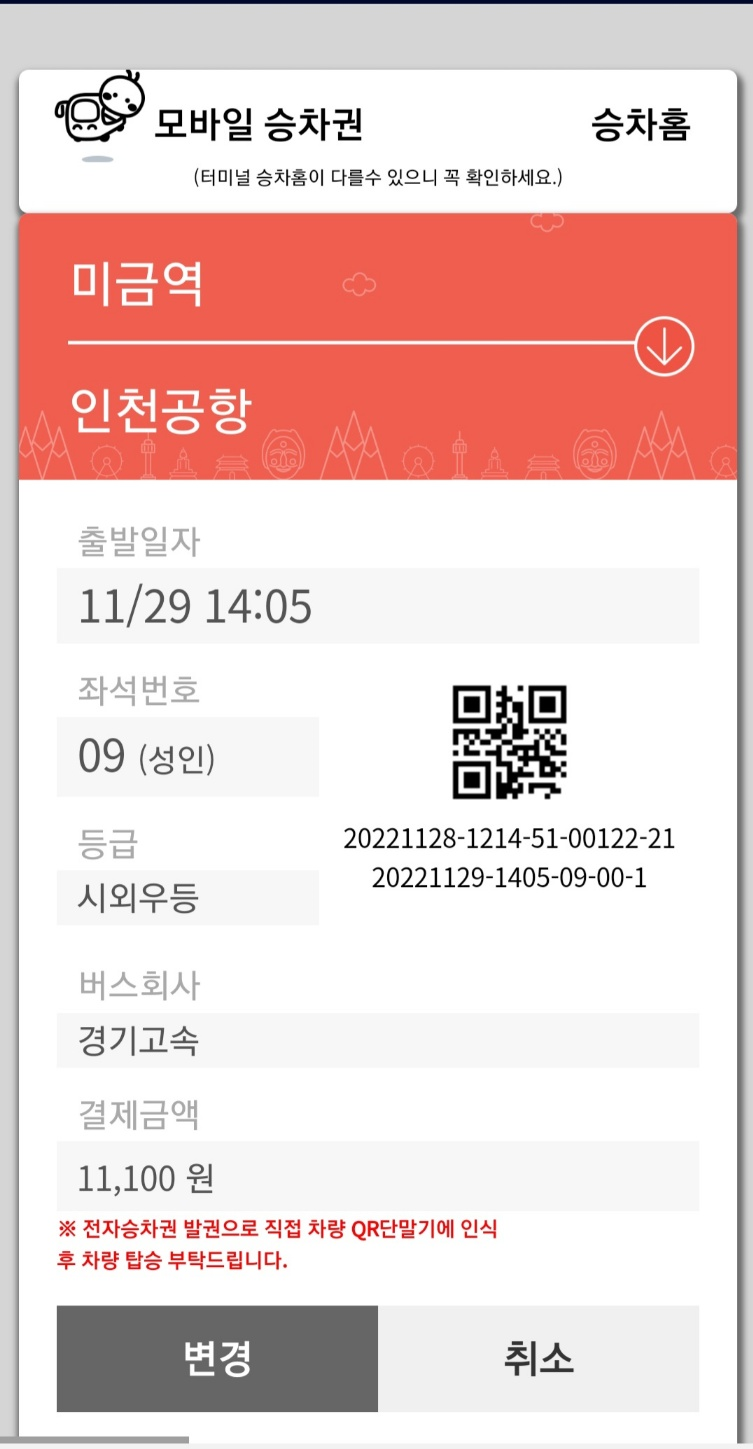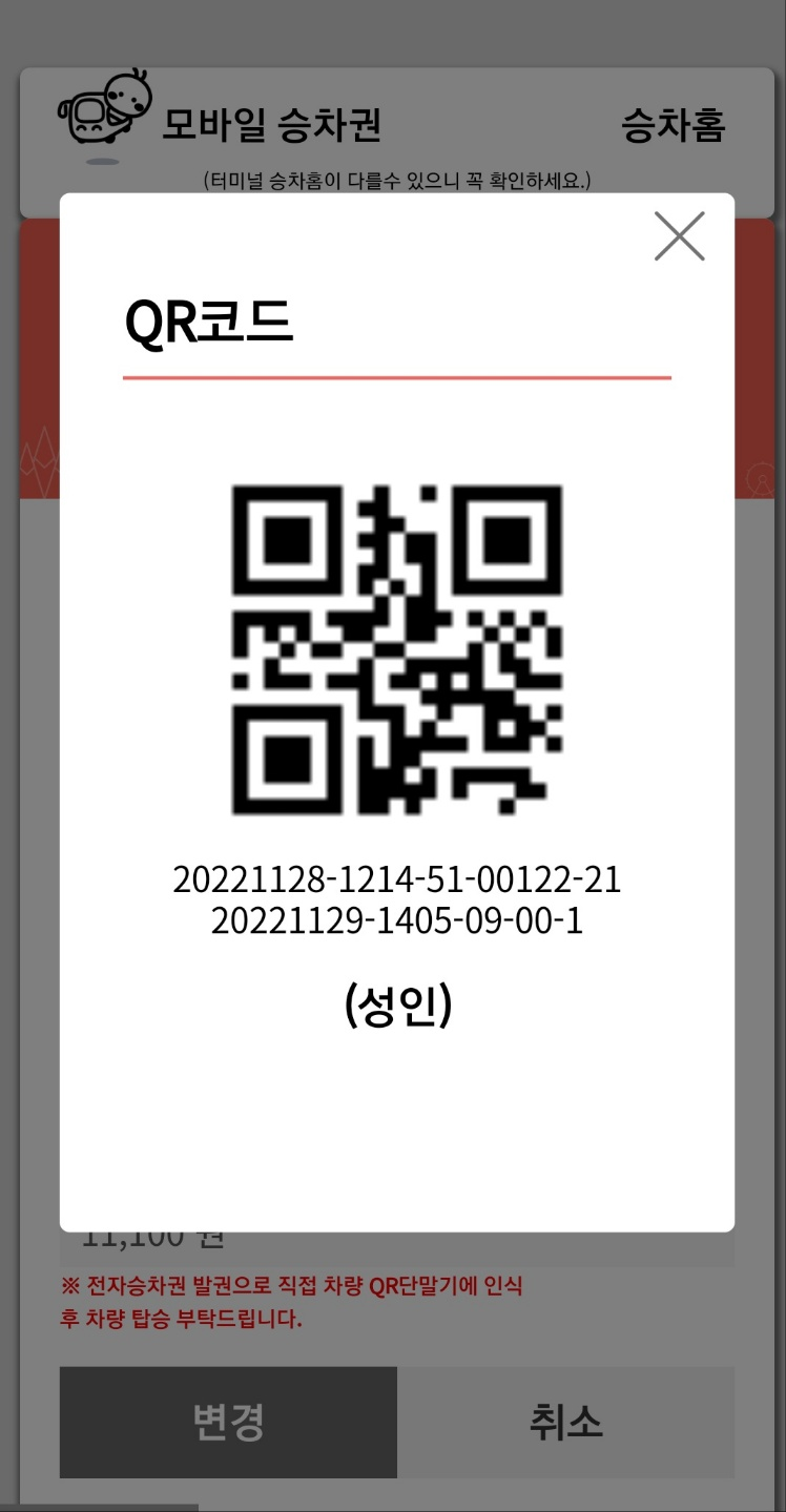 6. 결제 후 아래와 같이 QR코드가 발급됩니다. 버스 탑승시, QR코드 찍고 탑승하면 됩니다.