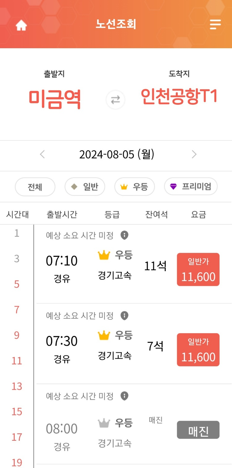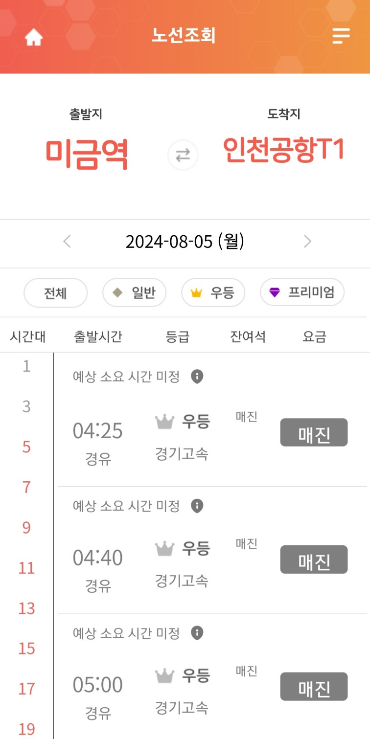 3. 출발시간 대에 가능한 버스를 조회해서 예매해주세요.